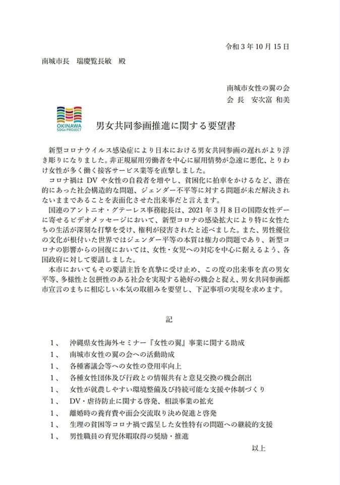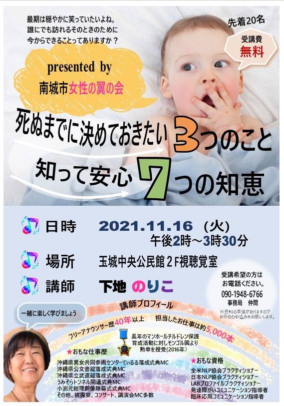 トップページ 地域翼 南城市女性の翼の会 イベントを開催します(2021年11月16日) 死ぬまでに決めておきたい3つのこと 知って安心7つの知恵 先着20名様(無料) 11月16日(火)14:00~15:30 玉城中央公民館2F視聴覚室 講師:下地のりこさん 南城市長へ表敬訪問に行きました!(2021年10月15日) つばさだより Vol.1 発行しました(2021年) つばさだより Vol.1(2021年2月発行) 市長表敬訪問(2020年) 会長 安次富 和美(7期)