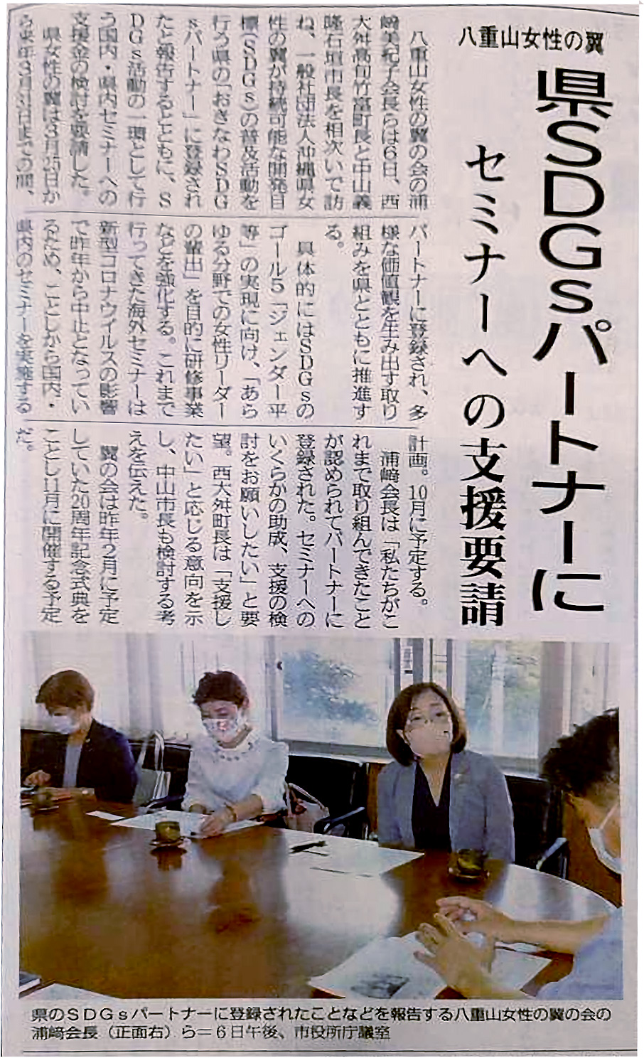 トップページ 地域翼 八重山女性の翼の会 竹富町長・西大舛高旬氏と石垣市長・中山義隆氏訪問(2021年4月6日) 3月25日に沖縄県女性の翼はSDGsパートナーの登録式を終え、地域女性の翼、八重山女性の翼の浦崎美紀子会長をはじめ、八重山女性の翼役員の皆さんが竹富町長・西大舛高旬氏と石垣市長・中山義隆氏を訪ね、「おきなわSDGsパートナー」に登録されたと報告したことが八重山毎日新聞と八重山日報に掲載されました。(ブログの記事はこちら) 2021年4月7日八重山毎日新聞(掲載許可確認済)