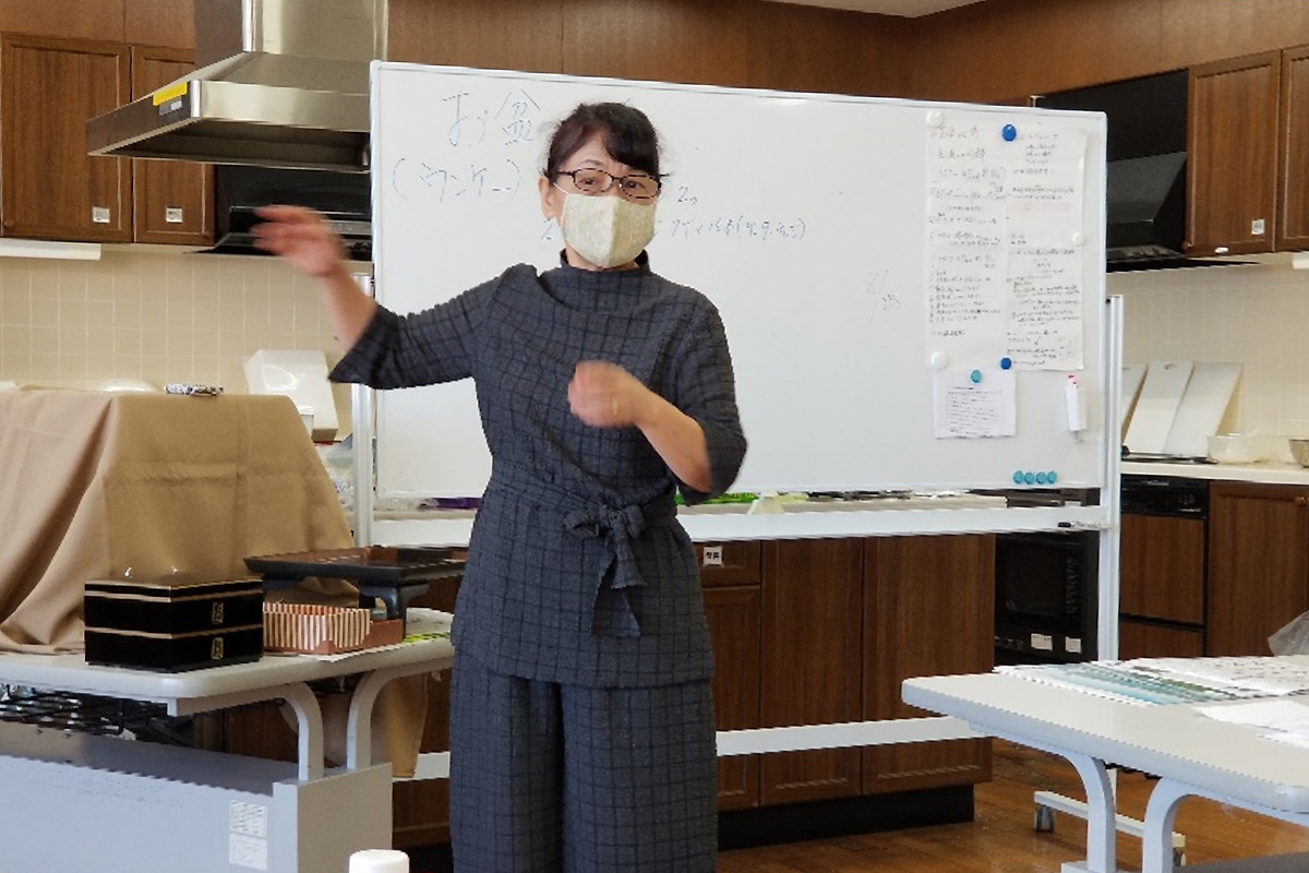 実技が伴いお膳の配膳される品々の中身、内容、重箱の中身も上から見て分かるように。