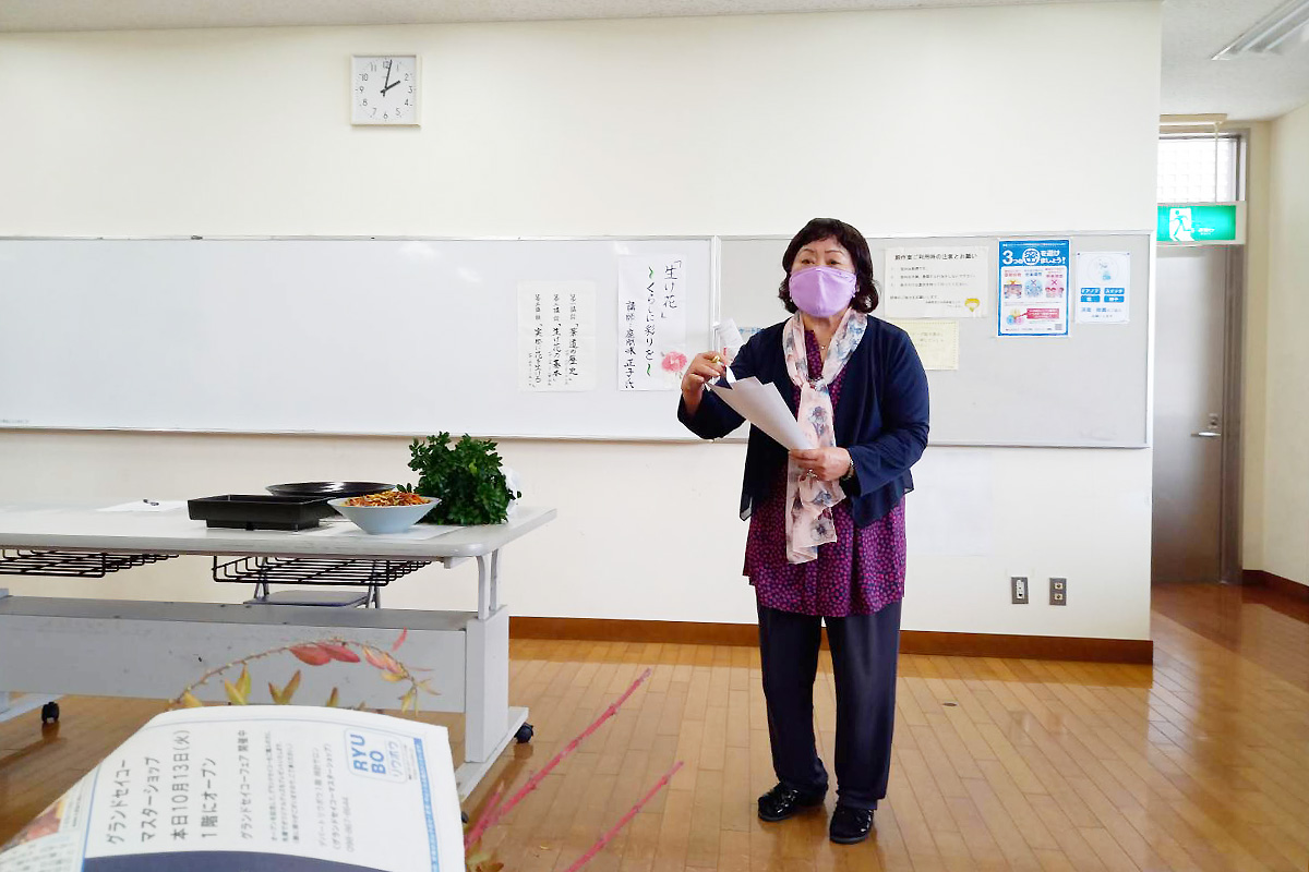 〇少ない材料費で、秋の風情の生花を生けることができ楽しかった。自然の風景を生活に取り入れることで彩があり、豊かな気分になる事を教わった。